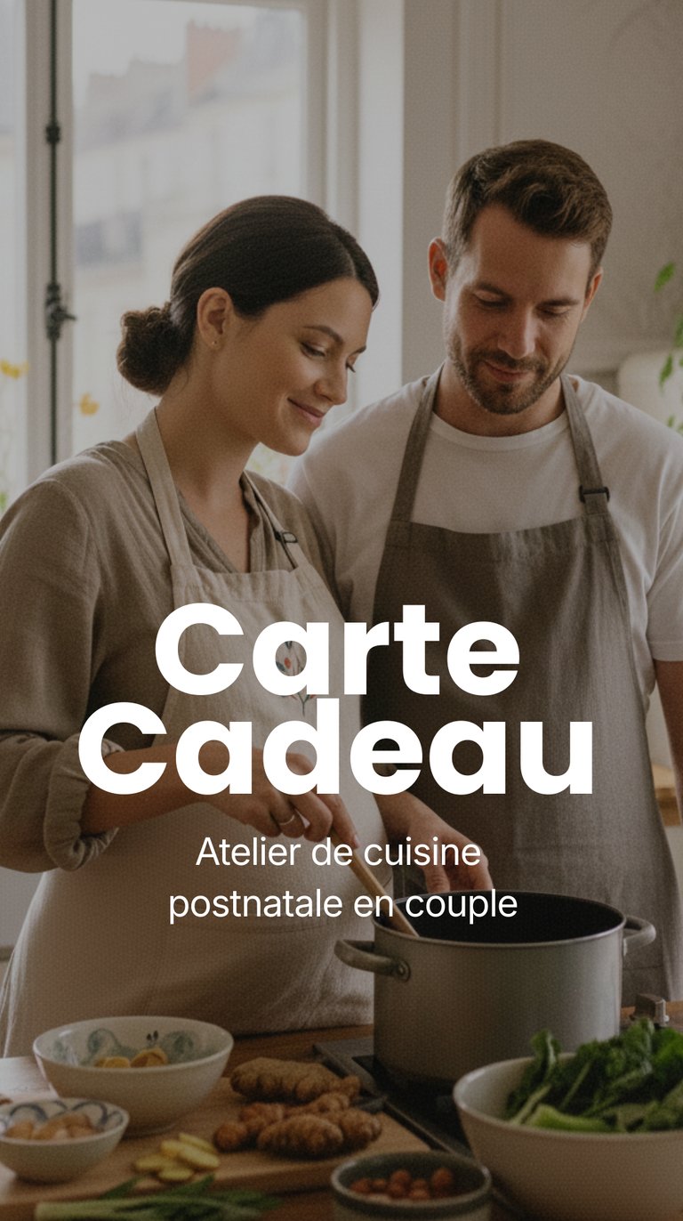 ➡️ C’est pour vous si vous souhaitez offrir aux futurs parents un atelier en tête-à-tête, chez eux, pour cuisiner ensemble et se préparer au post-partum en couple.