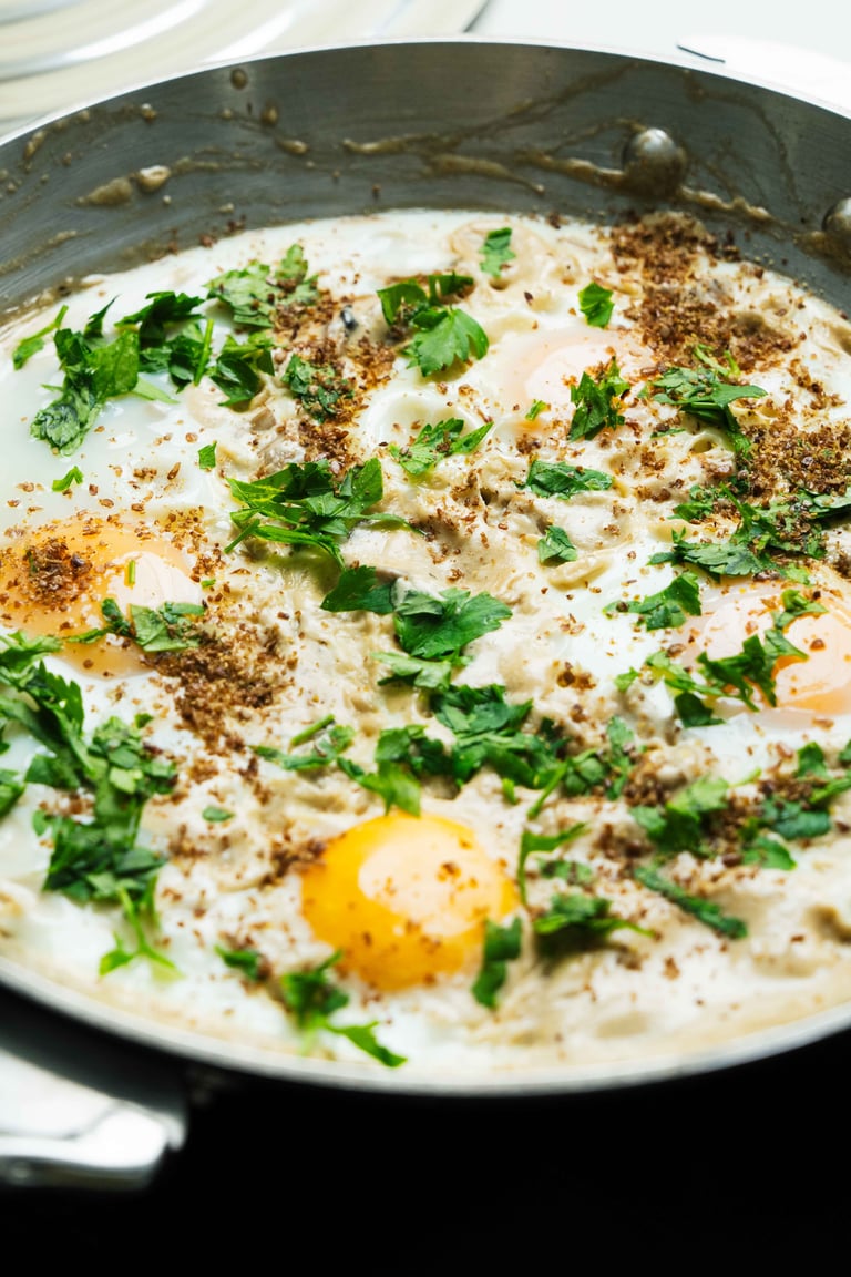 Après 2 à 3 minutes, casser les œufs directement dans la préparation. Couvrir et laisser cuire environ 5 minutes, selon la cuisson désirée des œufs. Parsemer de persil ciselé et de graines de lin moulues avant de servir.