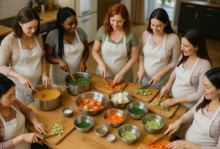 Atelier convivial entre futures parents pour anticiper les repas du post-partum.